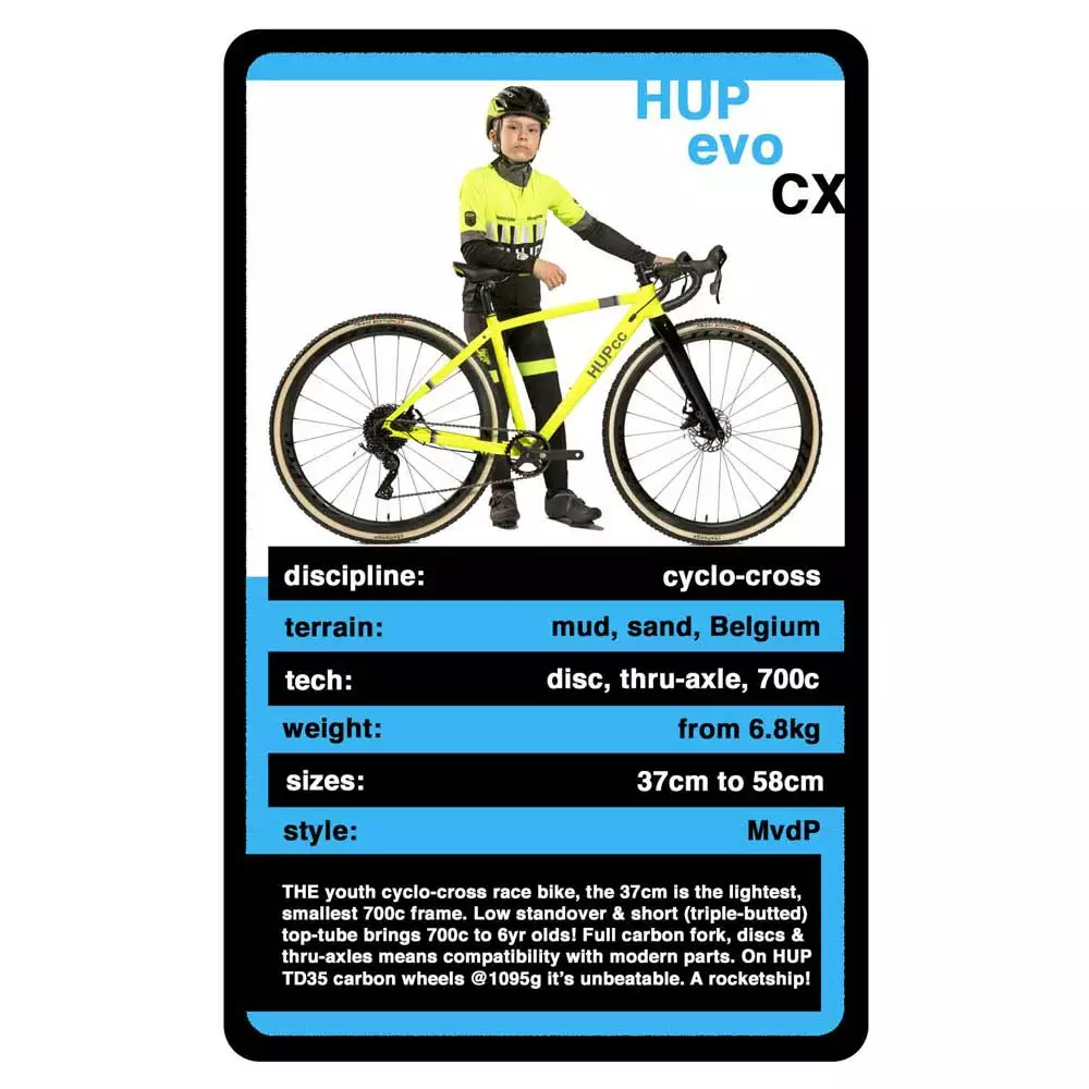 The unique HUP evo has become the benchmark for competative Youth cyclo-cross racing since launch in 2019, winning countless races and championships worldwide. The lightest frameset available with cutting-edge geometry and rider sized components – it’s in a league of it’s own. 37cm standard bikes are approx 8.5kg (high spec can be as low as UCI minimum weight 6.8kg) rising to approx 10kg for the 58cm standard build. Now you can create yours…