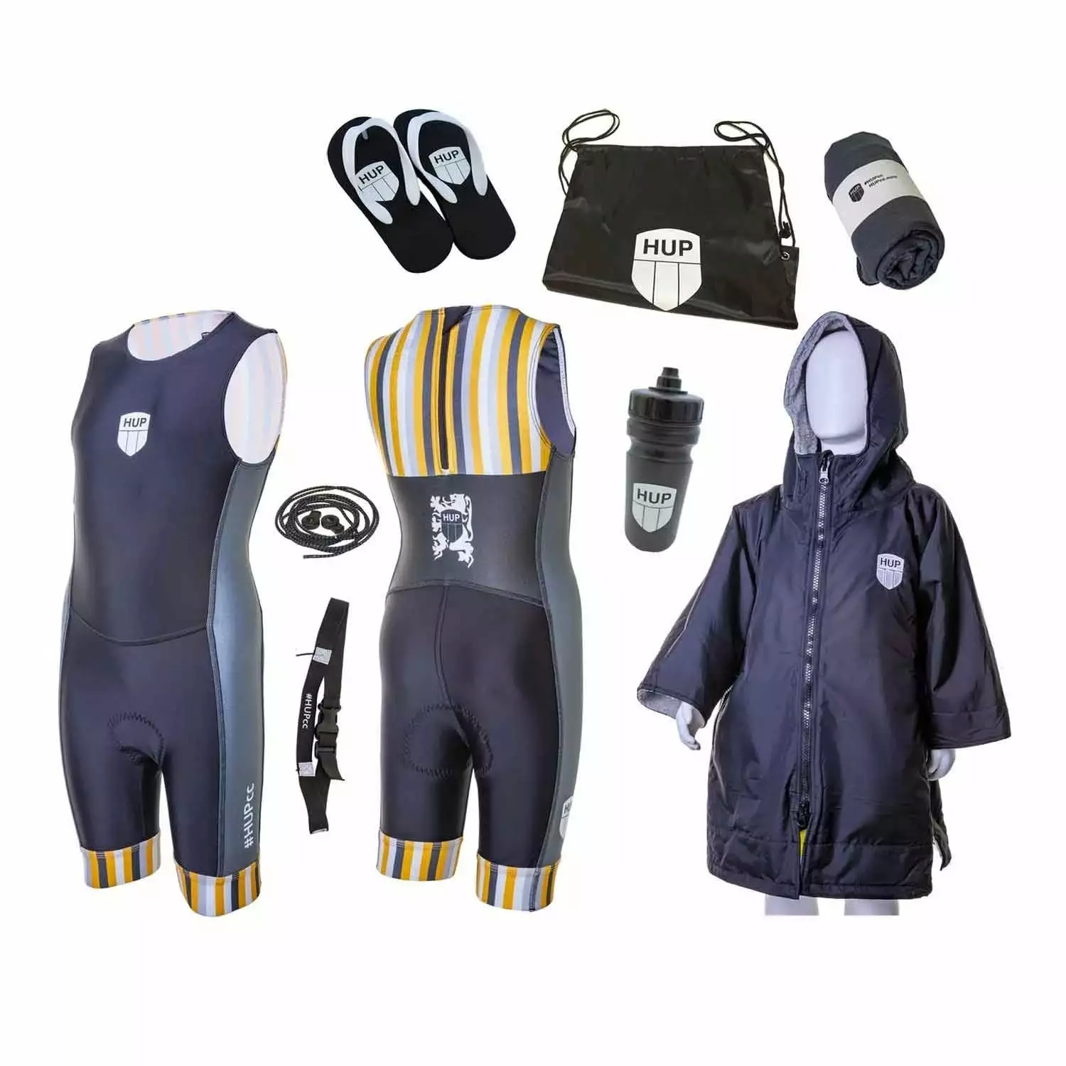 Our top-level Gold Triathlon Bundle puts together our high-performance Trisuit in a choice of colours, with our child-specific race number belt, elastic lock-laces, flip-flops, microfibre transition towel, water bottle and drawstring kit bag and the fantastic HUP warm-up jacket!
