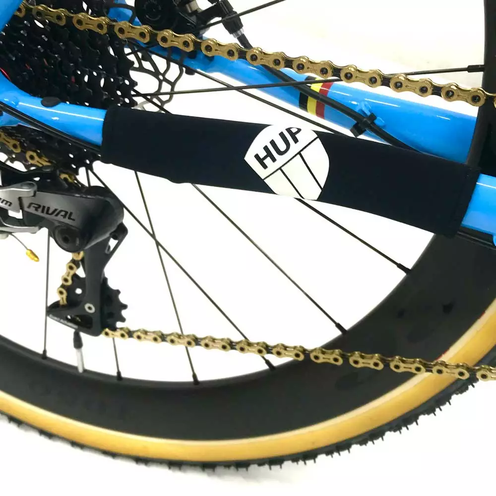 HUP Neoprene Chainstay Protector to protect chainstays on bikes using small diameter chainrings. Quick and easily fitted velcro fabric cover to stop a bouncing chain chipping the frame’s paint. 200mm long x 95mm wide (measured flat). Perfect for the HUP evo and straatrace bikes, will fit other manufacturer bikes too.