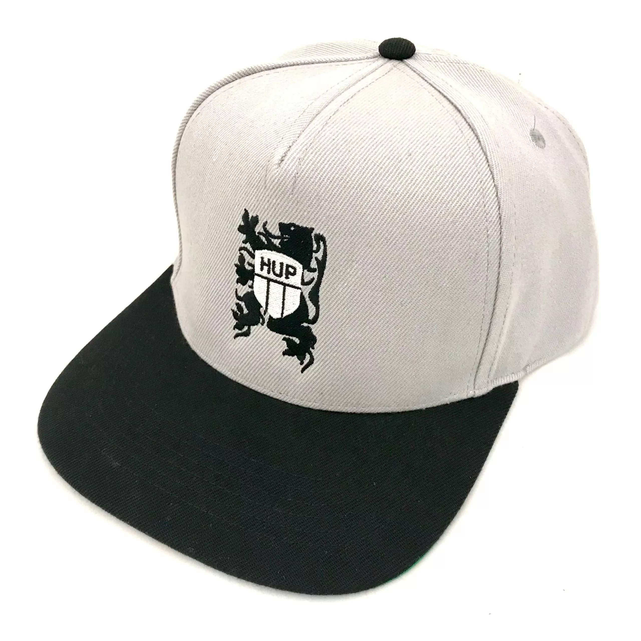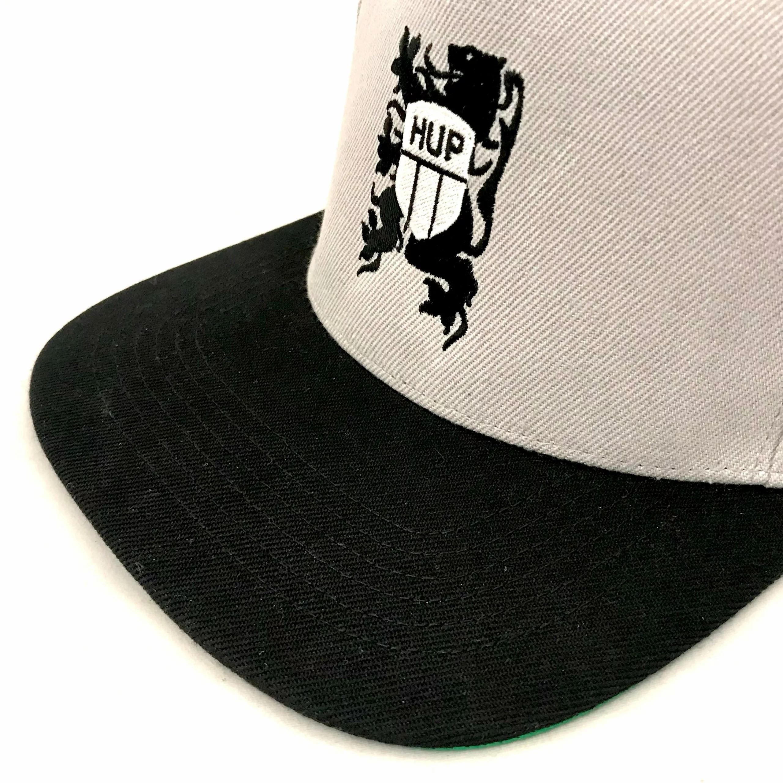 Stylish Grey and Black 2-tone cap and Green underpeak contrast, with embroidered HUP Lion logo and cool flat peak.